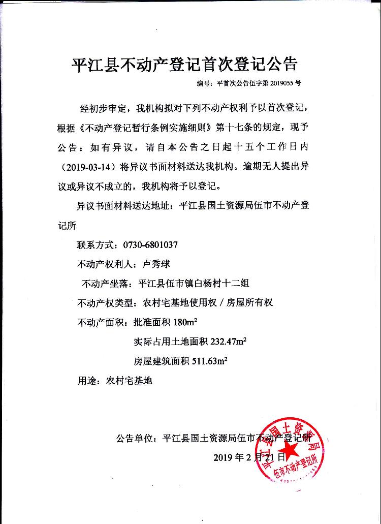 卢秀球 不动产首次登记公告 伍字第2019055号