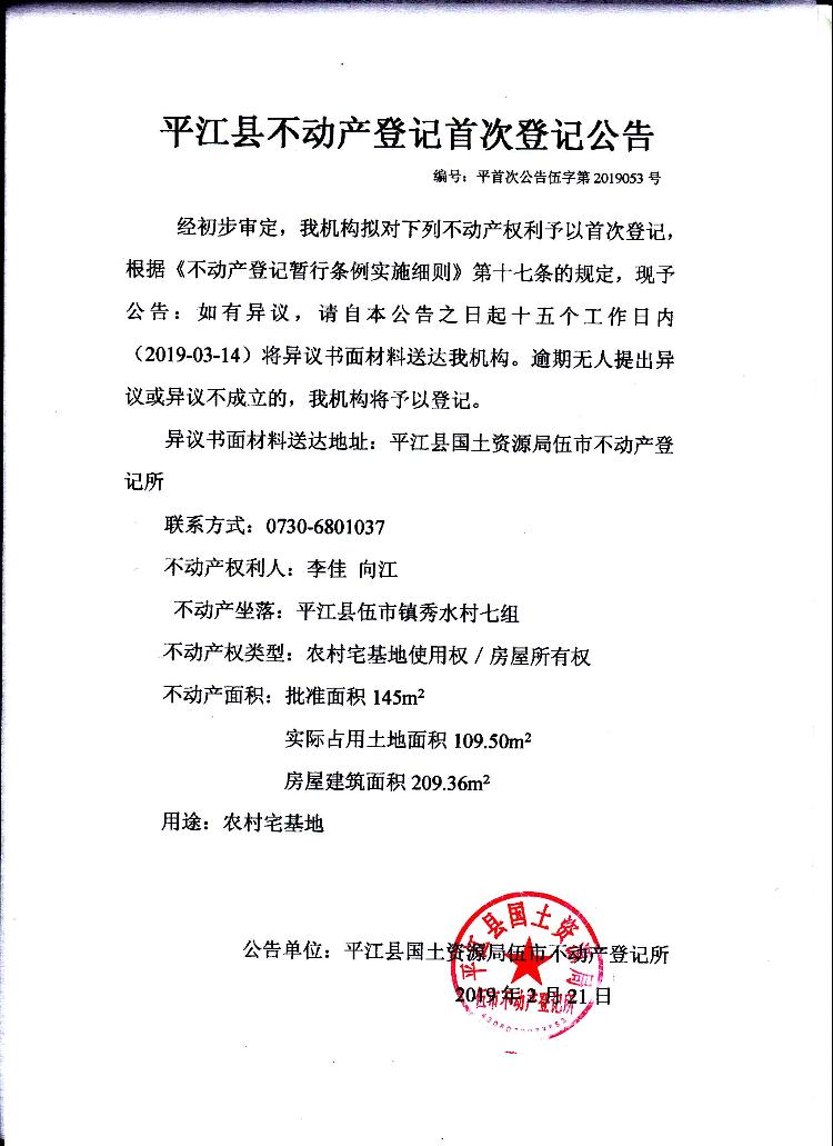 李佳 向江 不动产首次登记公告伍字第2019053号