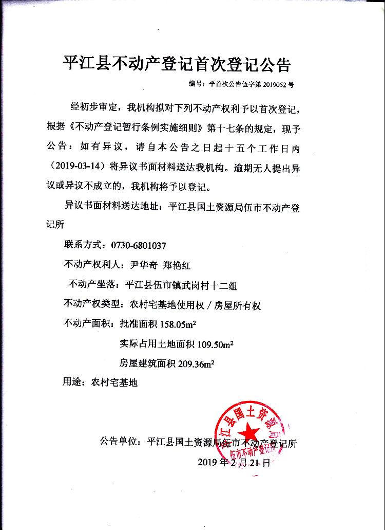尹华奇 郑艳红 不动产首次登记公告伍字第2019052号