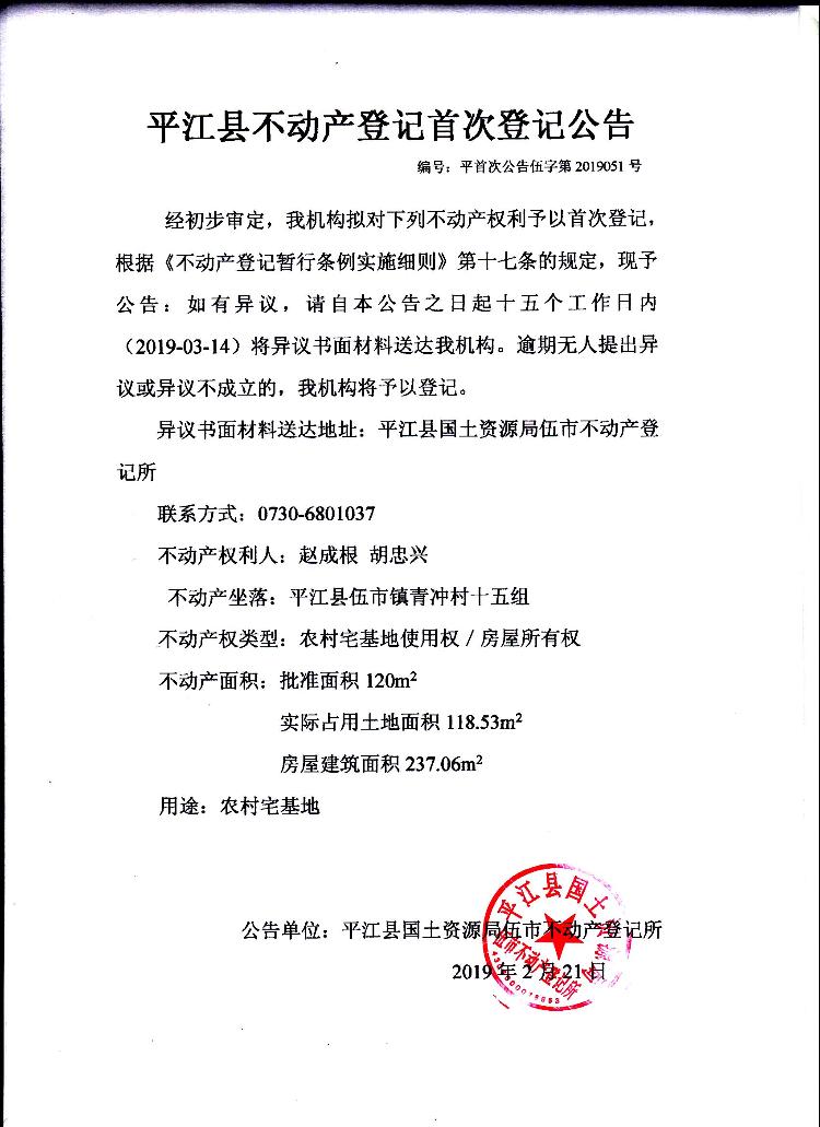 赵成根 胡忠兴 不动产首次登记公告 伍字第2019051号