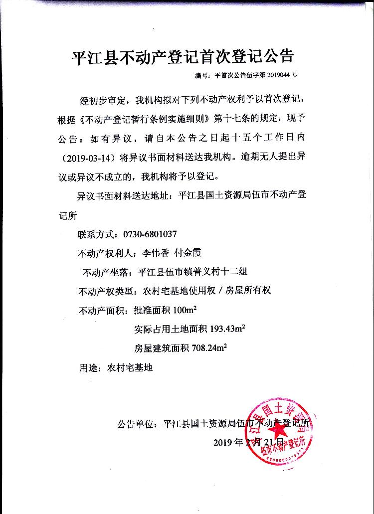 李伟香 付金霞 不动产首次登记公告伍字第2019044号