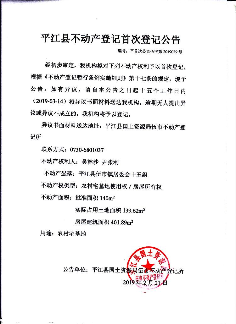 吴林沙 尹张利 不动产首次登记公告伍字第2019039号