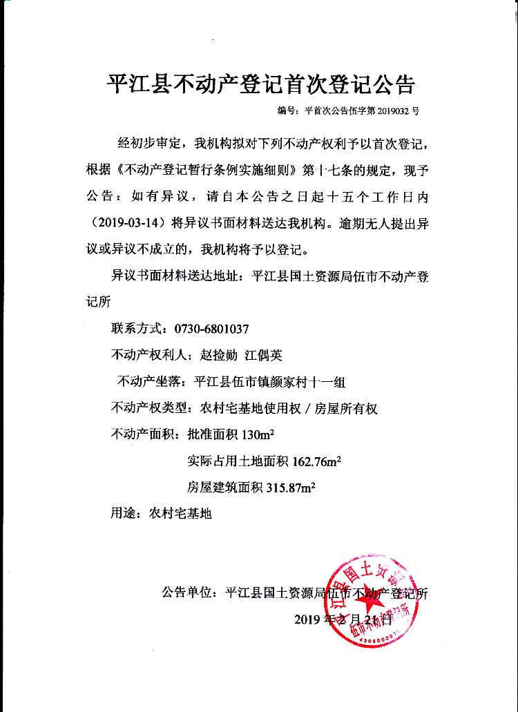 赵捡勋 江偶英不动产首次登记公告伍字第2019032号