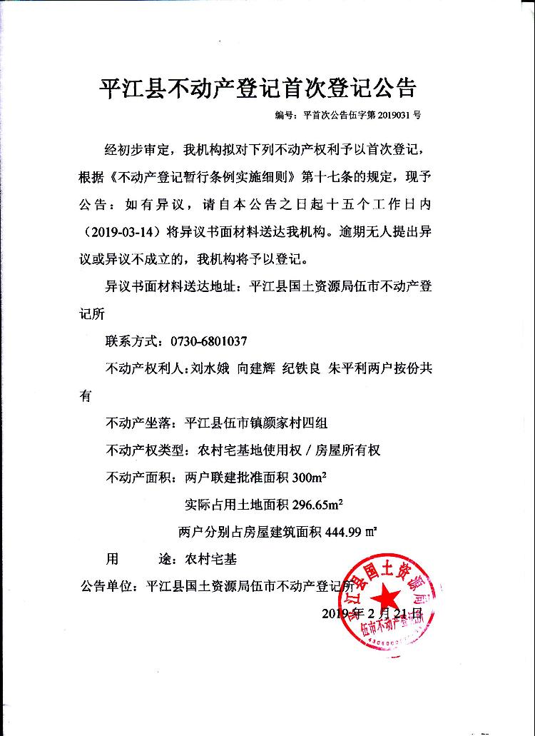 刘水娥 向建辉 纪铁良 朱平利两户联建不动产首次登记公告 伍字第2019031号
