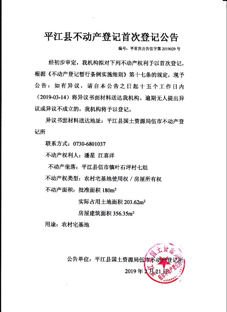 潘星 江喜洋 不动产首次登记公告 伍字第2019029号
