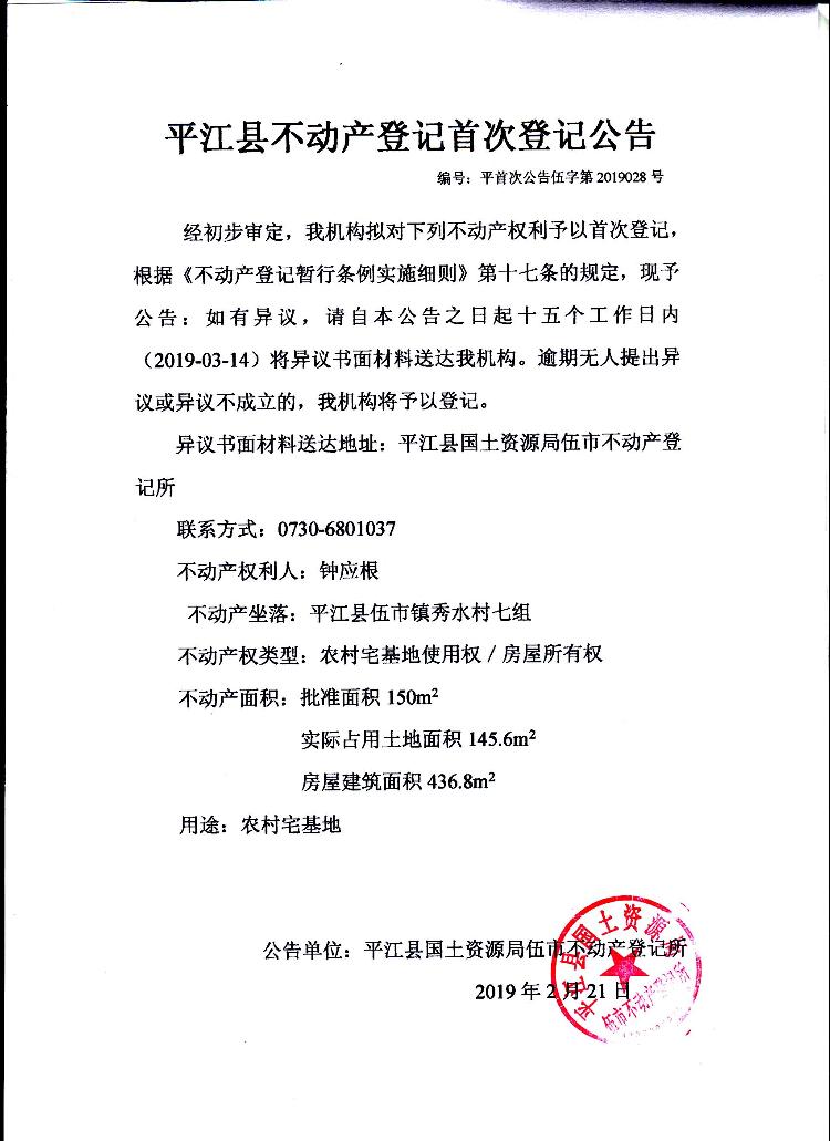钟应根 不动产首次登记公告伍字第2019028号