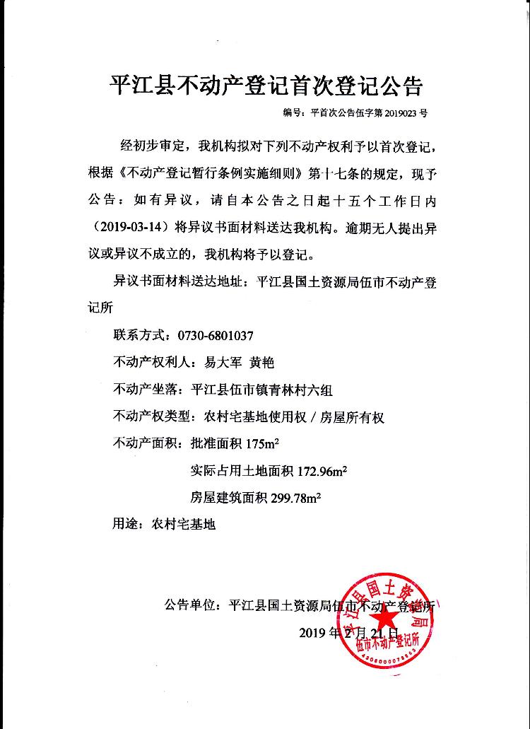 易大军 黄艳补动产首次登记公告 伍字第2019023号