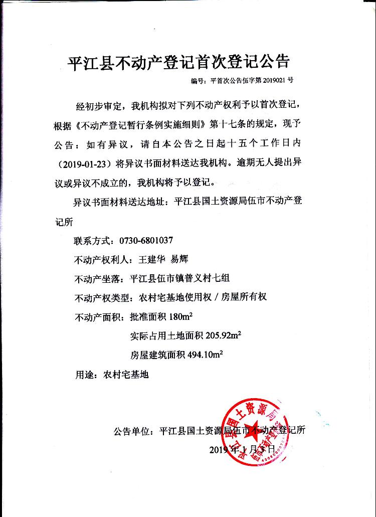 王建华 易辉 不动产首次登记公告 伍字第2019021号