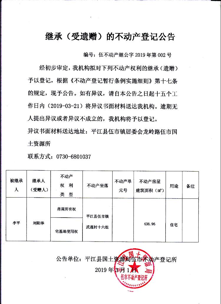 刘阳华 继承(受遗赠)不动产登记公告 伍不动产继公字2019年第002号