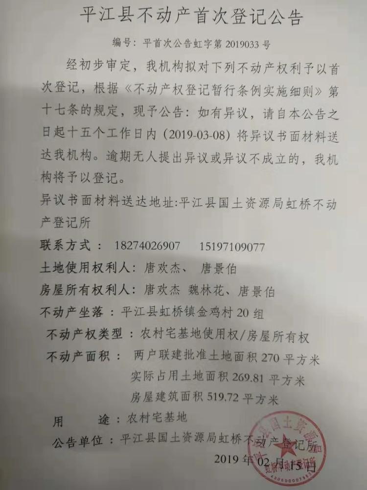 唐欢杰 魏林花 唐景伯不动产首次登记公告 虹字第2019033号