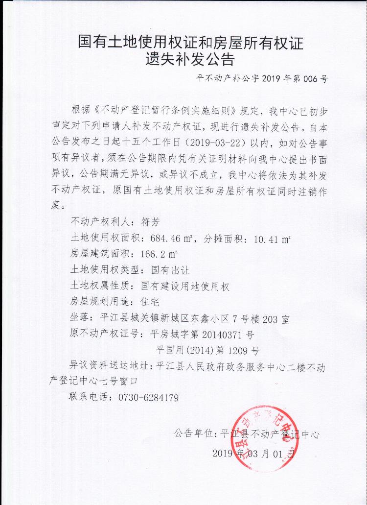 符芳国有土地使用权证和房屋所有权证遗失补发公告平不动产补公字2019年第006号