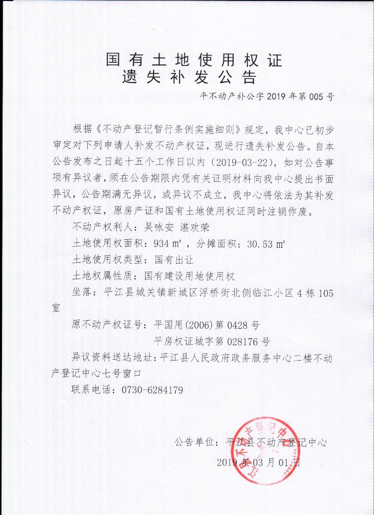 吴咏安 湛欢荣国有土地使用权证遗失补发公告平不动产补公字2019年第005号