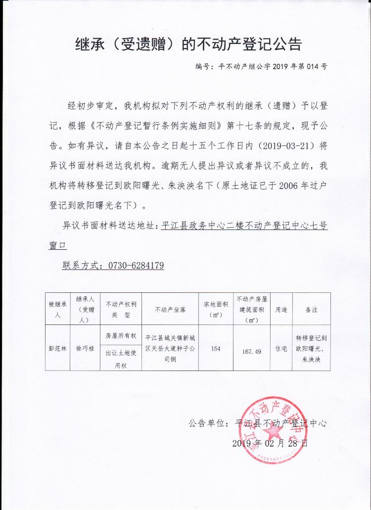 徐巧桂继承(受遗赠)的不动产登记公告平不动产继公字2019年第014号