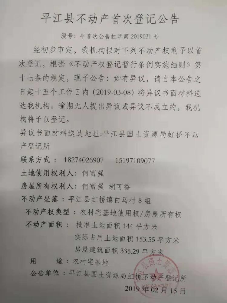 何富强 胡可香不动产首次登记公告 虹字第2019031号