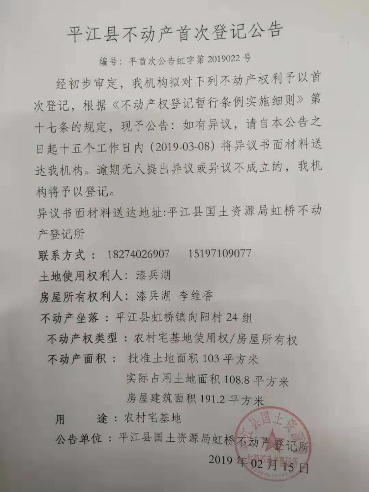 漆兵湖 李维香不动产首次登记公告 虹字第2019022号