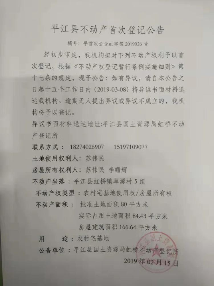 苏伟民 李曙辉不动产首次登记公告 虹字第2019026号