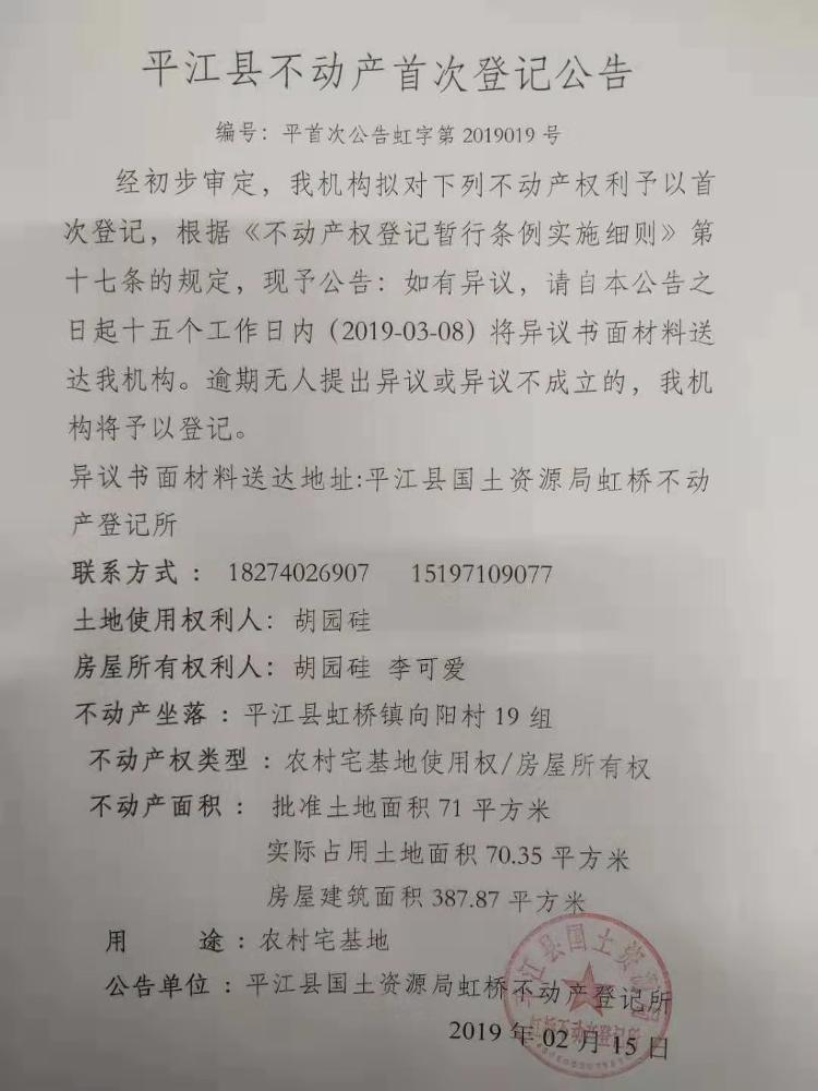 胡园硅 李可爱不动产首次登记公告 虹字第2019019号