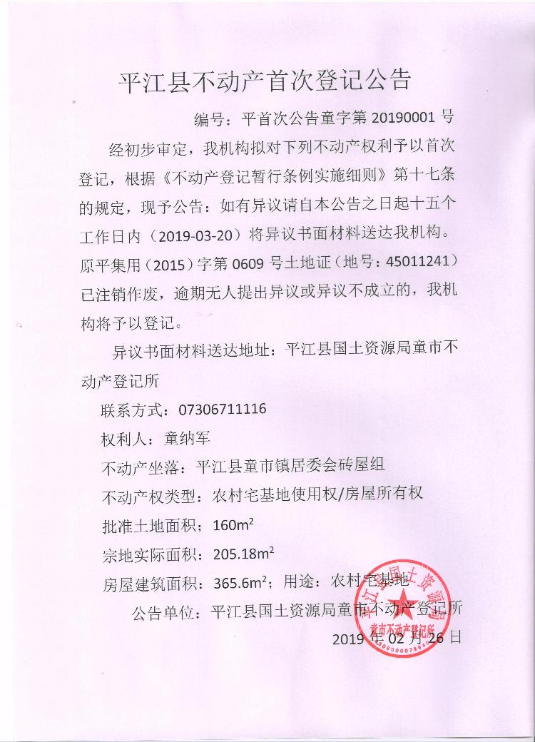 童纳军不动产首次登记公告 童字第20190001号
