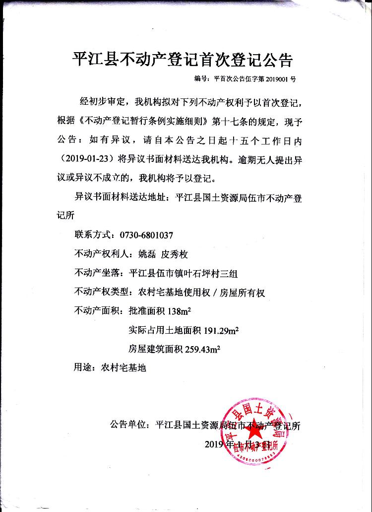 姚磊 皮秀枚不动产首次登记公告 伍字第2019001号