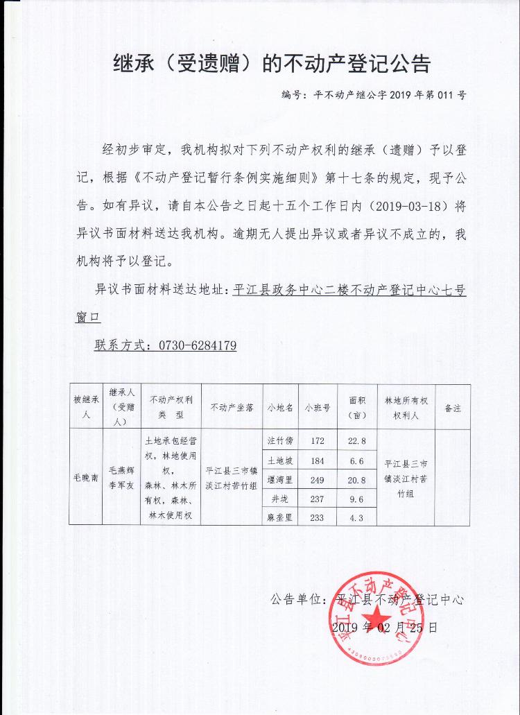 毛燕辉 李军友继承(受遗赠)的不动产登记公告平不动产继公字2019年第011号