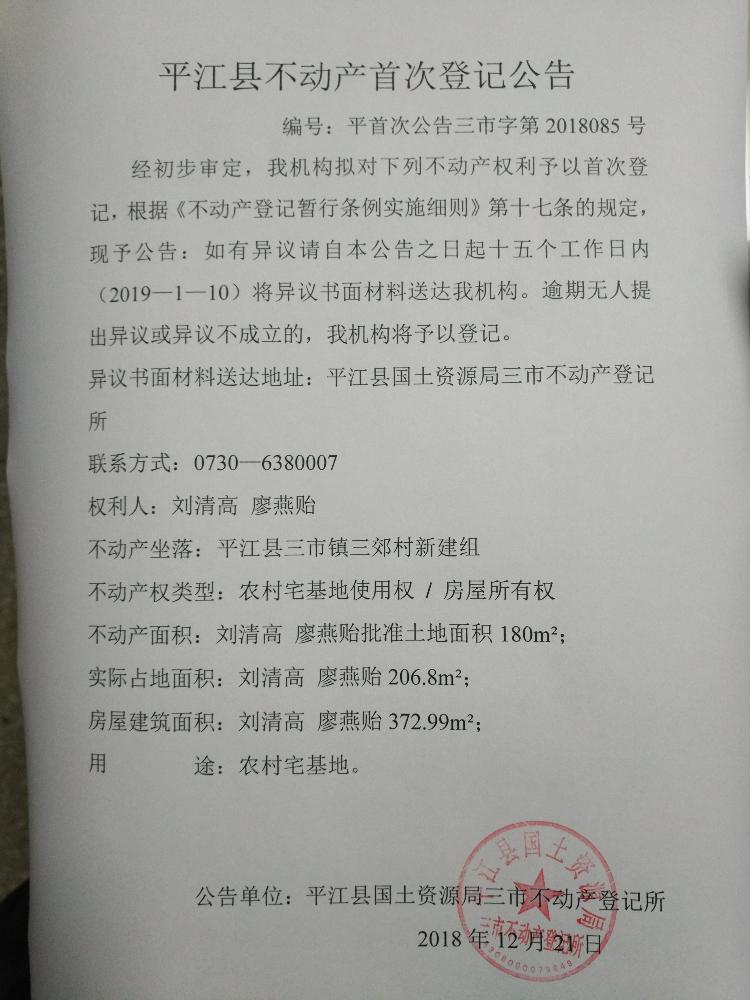 刘清高廖燕贻不动产首次登记公告三市字第2018085号