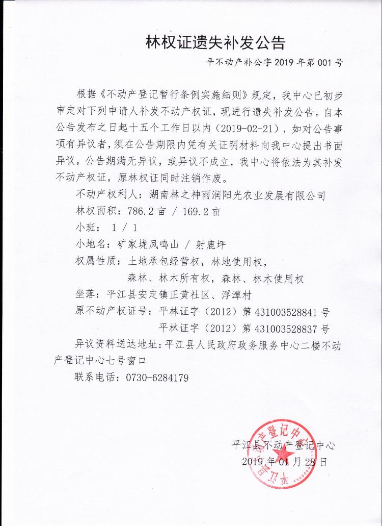 湖南林之神雨润阳光农业发展有限公司林权证遗失补发公告 平不动产补公字2019年第001号