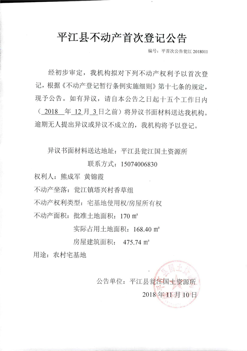 熊成军 黄锦霞平江县不动产首次登记公告 瓮江2018011