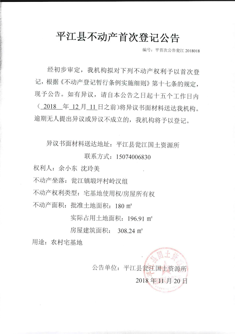 余小东 沈玲美平江县不动产首次登记公告 瓮江2018018