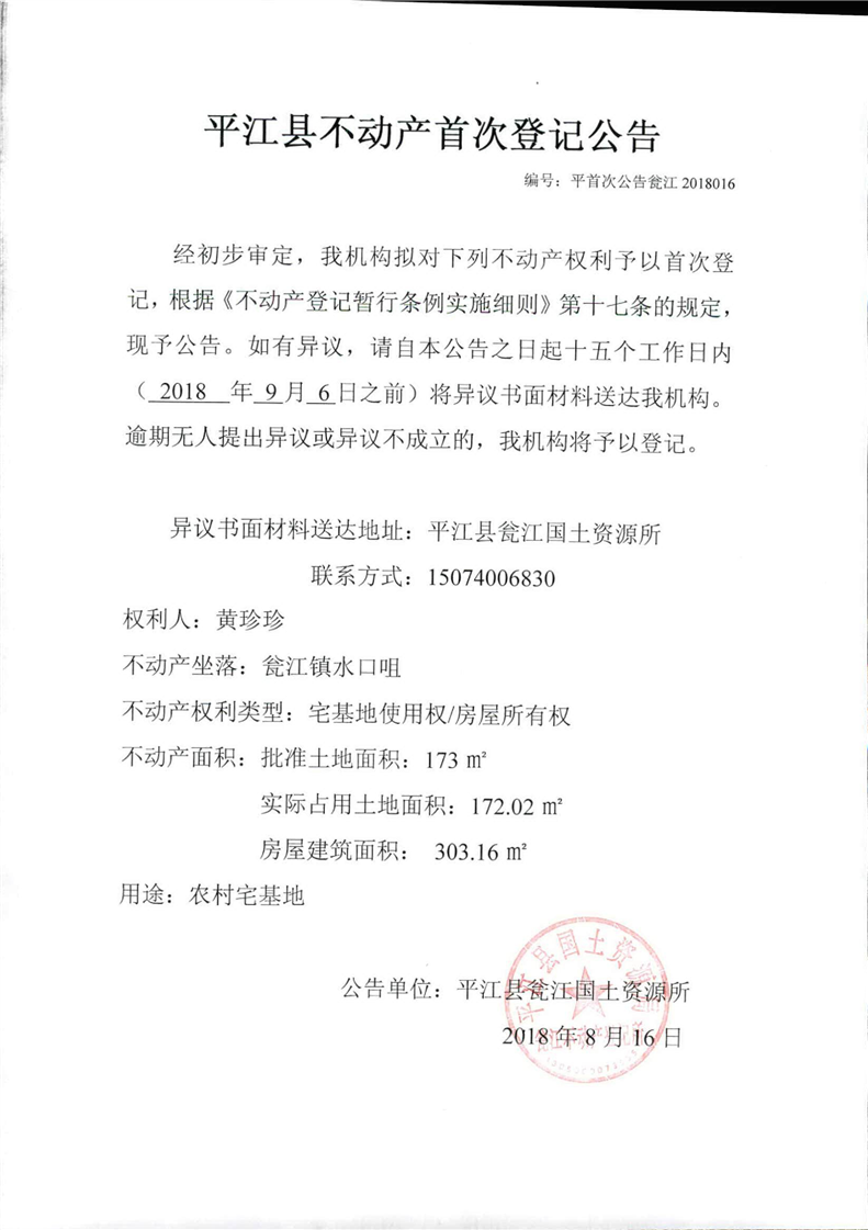 黄珍珍平江县不动产首次登记公告 瓮江2018016