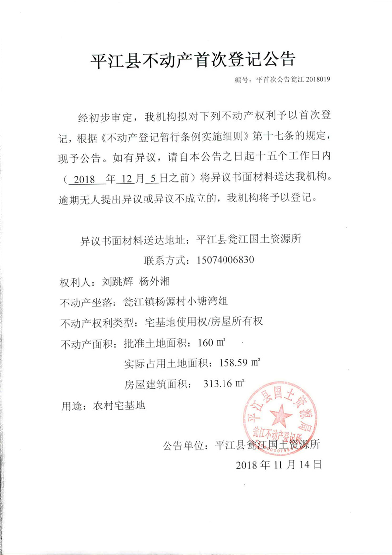 刘跳辉 杨外湘平江县不动产首次登记公告 瓮江2018019