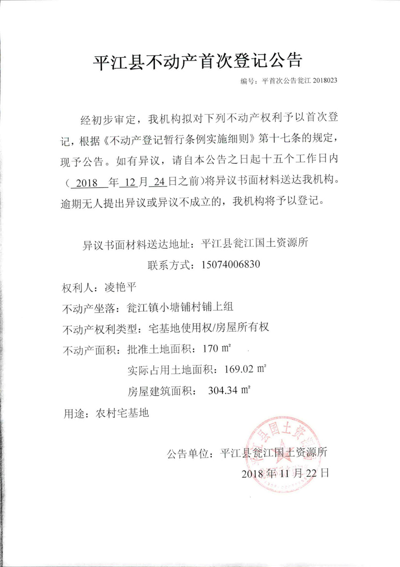 凌艳平平江县不动产首次登记公告 瓮江2018023