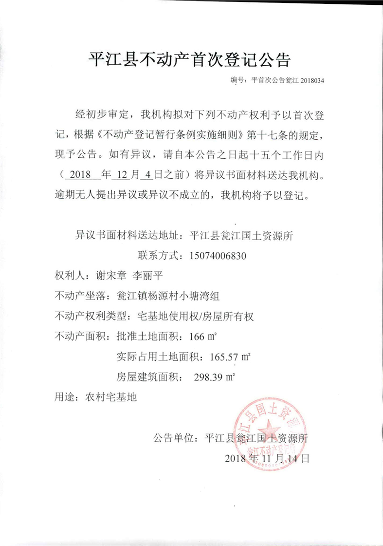 谢宋章 李丽平不动产首次登记公告 瓮江2018034