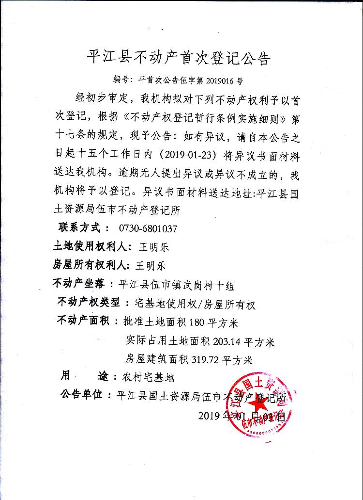 王明乐 不动产首次登记公告伍字第2019016号