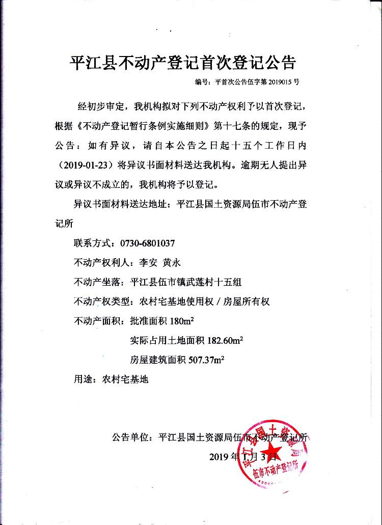 李安 黄永 不动产首次登记公告伍字第2019015号