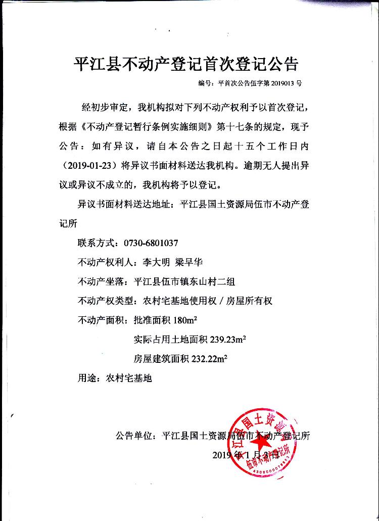 李大明 梁早华 不动产首次登记公告伍字第2019013号