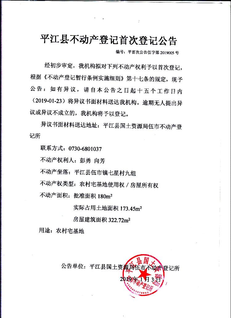 彭勇 向芳不动产首次登记公告 伍字第2019005号