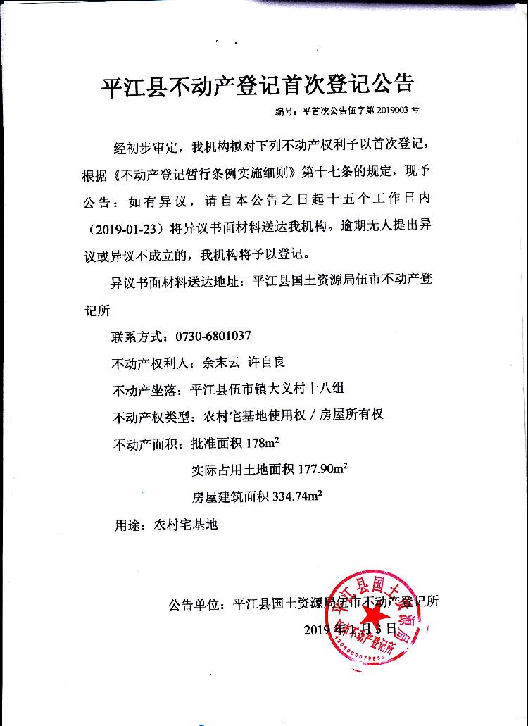 余末云 许自良 不动产首次登记公告伍字第2019003号