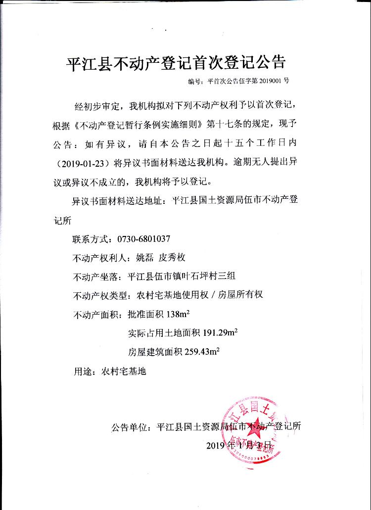 姚磊 皮秀枚 不动产首次登记公告伍字第2019001号