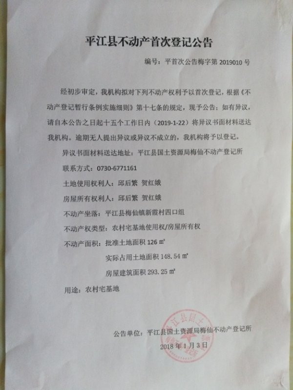 邱后繁 贺红娥不动产首次登记公告 梅字第2019010号