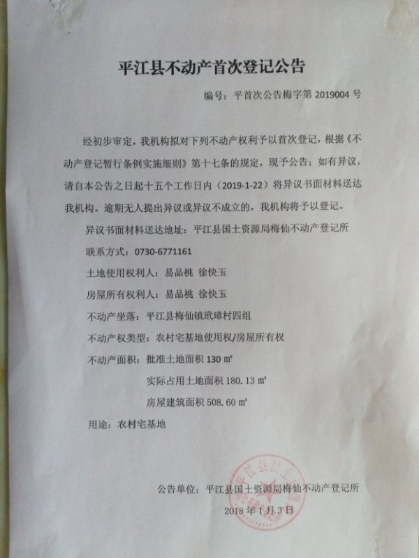 易品桃 徐快玉不动产首次登记公告 梅字第2019004号