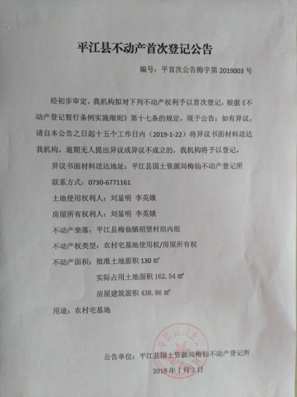 刘显明 李英娥不动产首次登记公告 梅字第2019003号