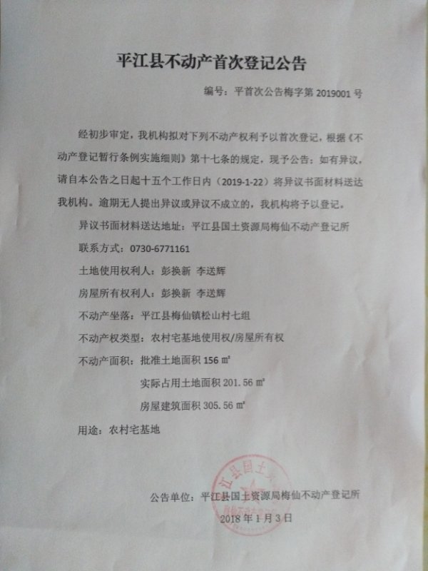 彭换新 李送辉不动产首次登记公告 梅字第2019001号