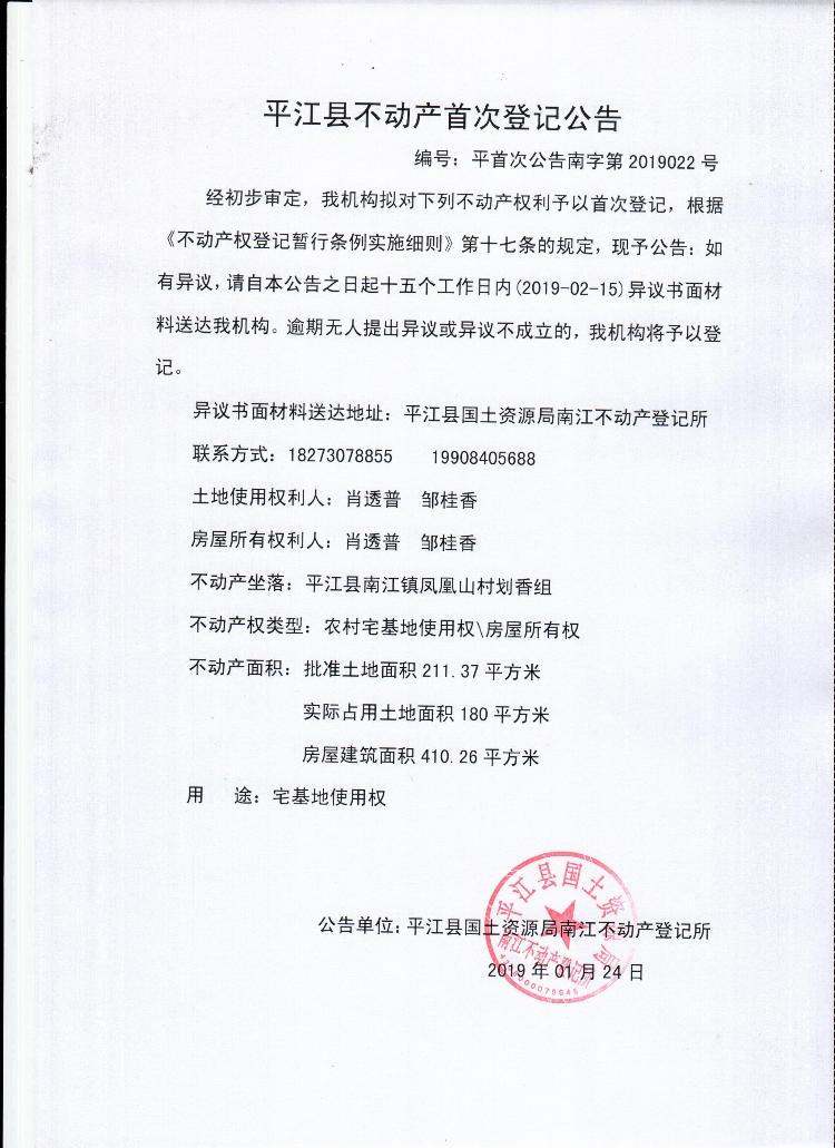 肖透普 邹桂香平江县不动产首次登记公告南字第2019022号