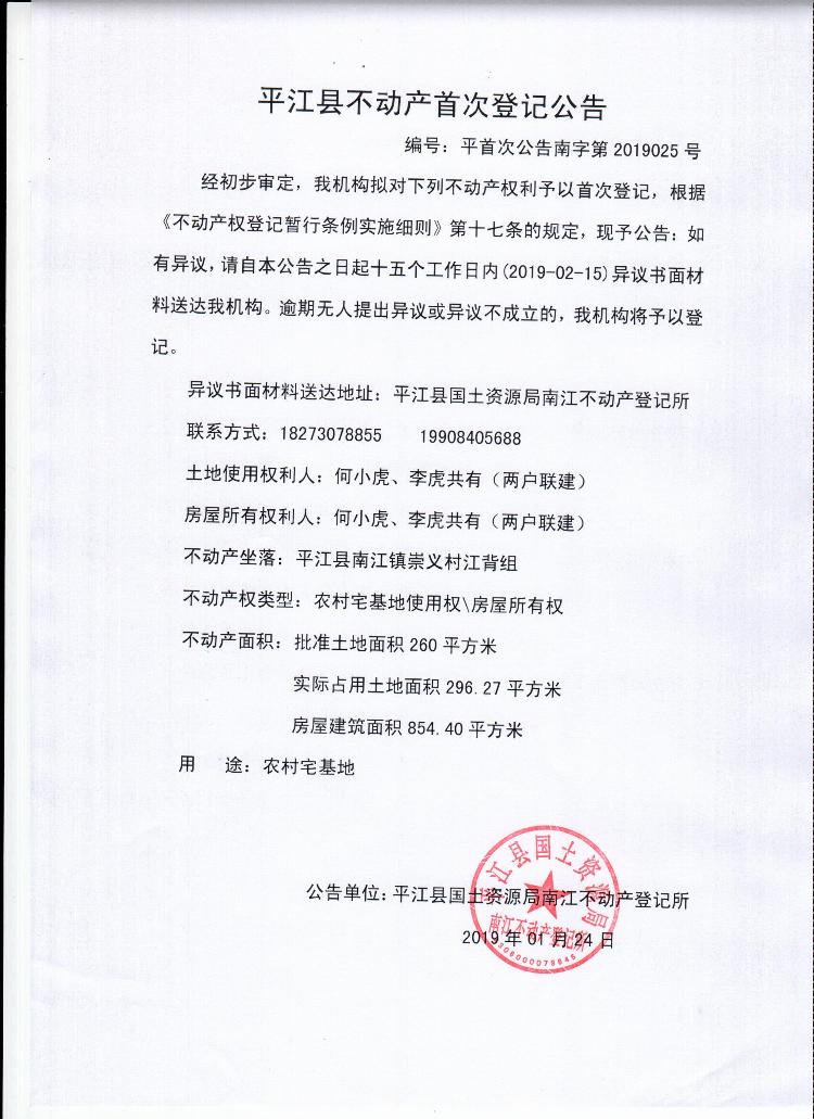 何小虎 李虎平江县不动产首次登记公告南字第2019025号