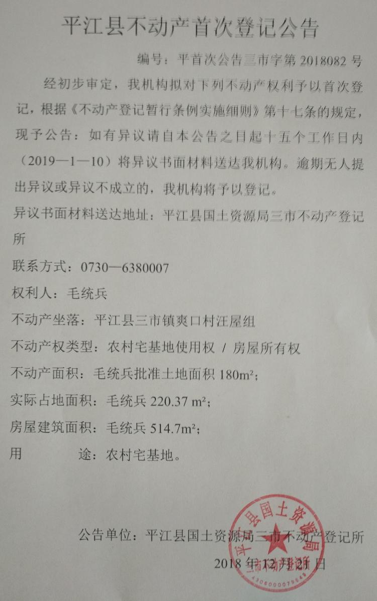 毛统兵不动产首次登记公告 三市字第2018082号