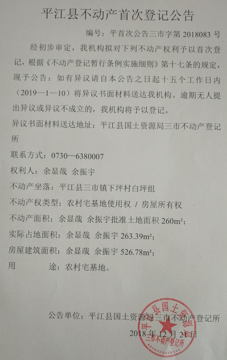余显哉 余振宇不动产首次登记公告 三市字第2018083号