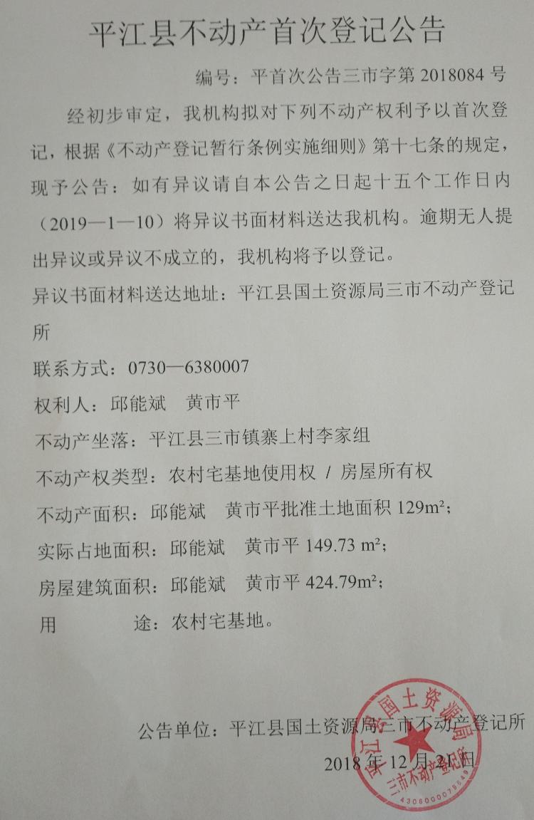 邱能斌 黄市平不动产首次登记公告 三市字第2018084号