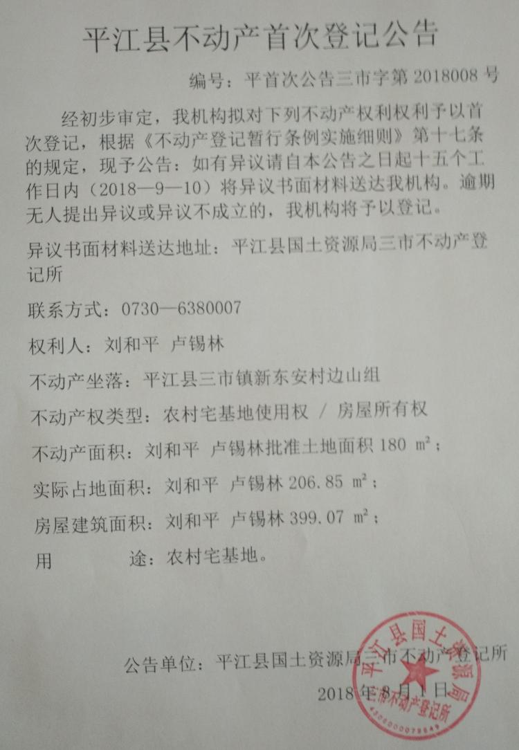 刘和平 卢锡林不动产首次登记公告 三市字第2018008号