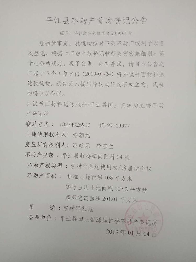 漆朝元李燕兰平江县不动产首次登记平首次公告虹字第2019004号