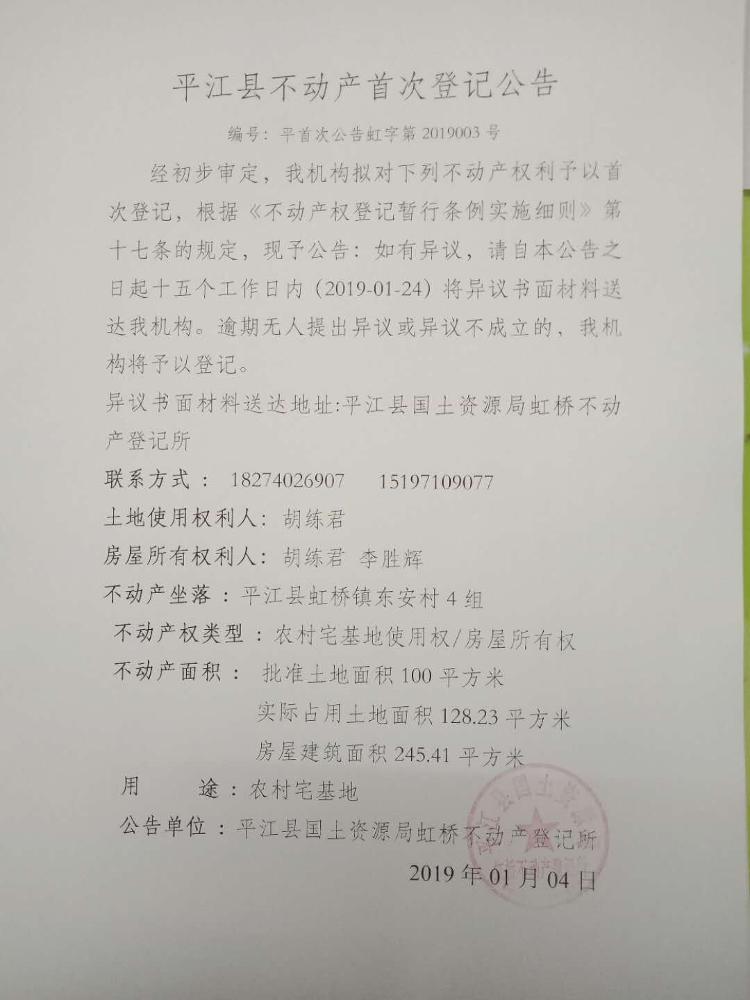 胡练君李胜辉平江县不动产首次登记平首次公告虹字第2019003号